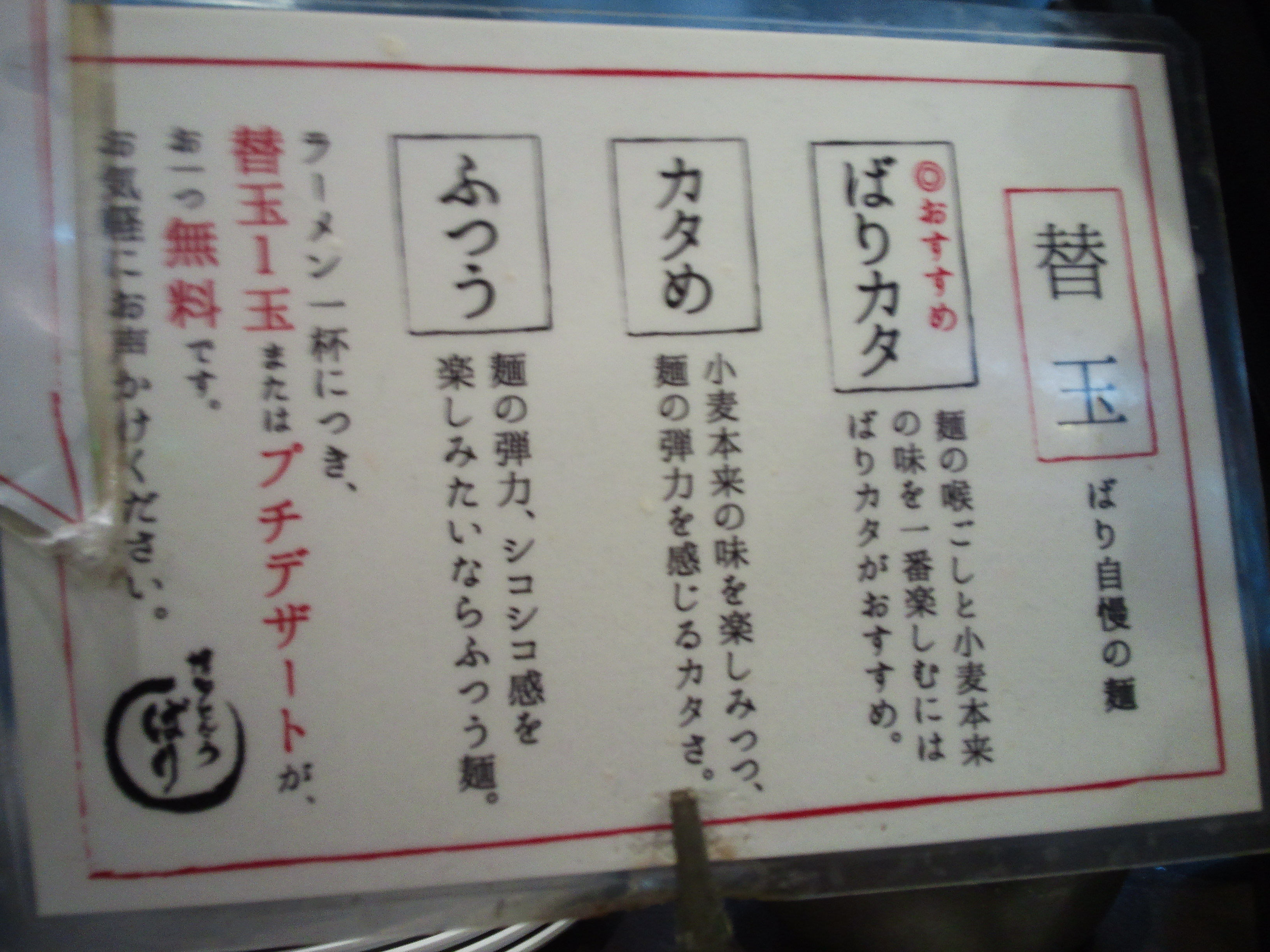 今回は麺、油、味ともに「普通」で頼みましたが、ここではそれぞれ、硬(多・濃)・普通・軟(少・薄)と自分の好みで内容を組み合わせることが出来ます。(例:麺=硬い、油=少、味=普通、等々)