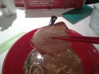 なかなか大きく、しかも厚い。増量したのでこれが全部で8枚入っていました。 パクつくと口の中にジューシーなチャーシューの味が広がります。味付け自体には特に特徴的なものは感じられず、一般的なチャーシューの味でした。8枚も食べると、「食ったぞ」という充実感が得られますね。
